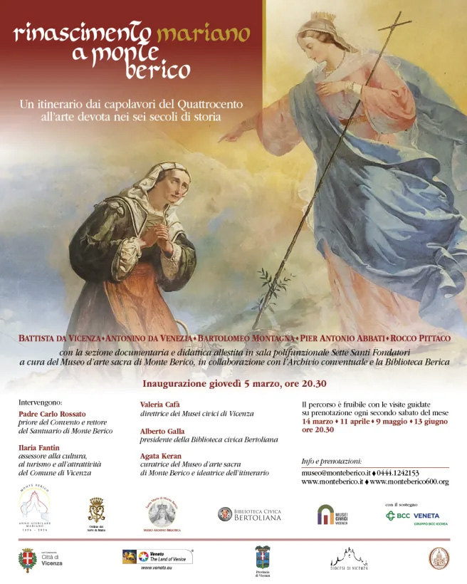 Giovedì 5 marzo alle ore 20.30, in occasione della settimana del sesto centenario della prima apparizione mariana a Monte Berico, partirà la prima “puntata” della mostra diffusa dedicata al tema del Rinascimento mariano. L’itinerario in rete, sviluppato in tre sedi e in momenti diversi dell’Anno Giubilare Mariano è promosso dal Museo d’arte sacra di Monte Berico, in partneriato con il Museo Civico di Palazzo Chiericati e la Biblioteca civica Bertoliana, i quali presenteranno nei prossimi mesi gli esiti della propria progettualità, attraverso due mostre dossier di respiro quattrocentesco, calendarizzate nei prossimi mesi.